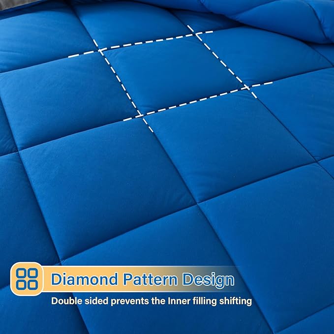 - Reversible Diamond Pattern Design: The bedding comforter set adopt a blue and grey two tones color double sided with design of the diamond pattern, not only perfectly fitting various types of bedroom decoration but also helps evenly distribute the fiberfill and prevents shifting for maximum durability.