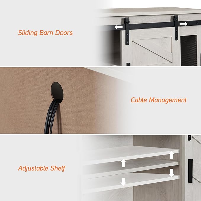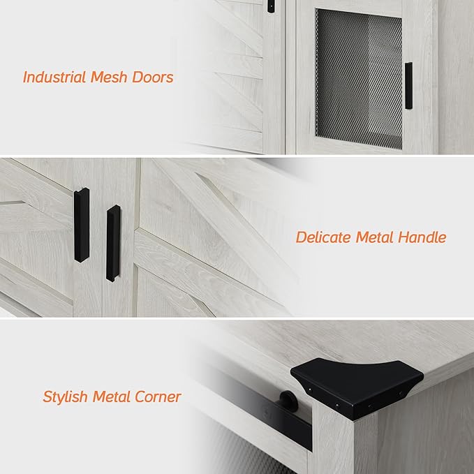 - Sliding Barn Doors:Our two sliding barn doors are designed with a special quality metal barn door pattern. Easy access to cabinets and shelves via metal track,,slide smoothly and quietly.