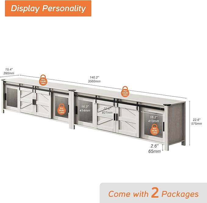 WAMPAT Modern Wood Entertainment Center for ups to 100 inch TV, Set of Two 70" Sliding Barn Door Media TV Console Table with Storage Shelf for Living Room Bedroom,Antique White