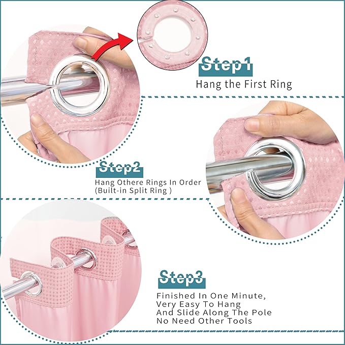 - SUPER EASY TO INSTALL : This shower curtain design with High Quality Flex On Rings that you can very easy to install it in one minute, smart design will made it easier to hang and slide along the pole.