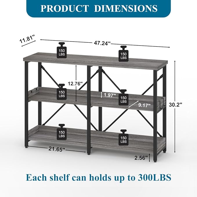 - Suitable Dimensions - Measuring 11.81"D x 47"W x 30.12"H, this front door table fits seamlessly into various spaces. The matte black metal frame and grey wood grain finish shelves blend elegance with farmhouse charm.