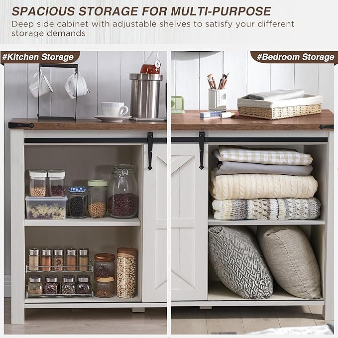 - SLIDING BARN DOORS: The farmhouse space-saving barn door slides open on a metal track to reveal adjustable shelf space, allowing you to freely hide or show storage spaces. The shelf with 3 height adjustable and is also removable enabling flexible storage of different-sized items. The smooth-glide track makes it convenient for people of all ages and abilities to open and close with minimal effort. The dresser with sliding barn doors can be particularly beneficial to maintain a clutter-free and organized look.