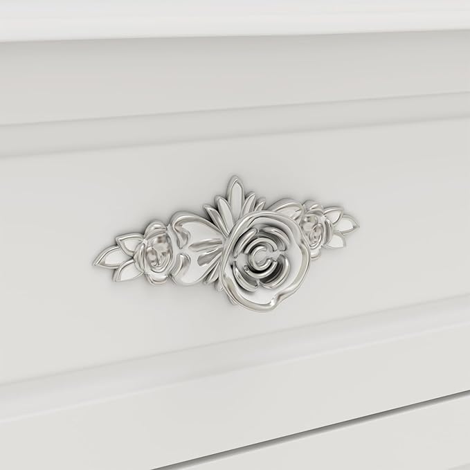 - [Modern Appearance] - This makeup vanity with mirrors and lights uses white panels, carved drawer fronts and silver flower handles to create elegant charm, the shelf under the desktop can also store items. This white vanity table fits well with various house decors.