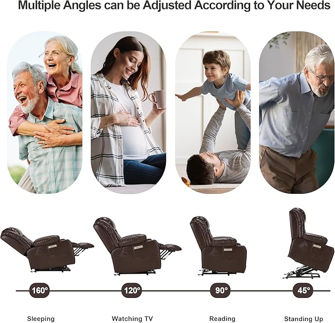 - Power Lift Assistance: Just press the button on the remote control to control the lift or tilt of the power lift recliner chair, you can get any position you want, either tilt or lift between 45 to 160 degrees, the lift chair is powered by an electric mechanism that pushes the whole chair upwards and works smoothly and quietly to help seniors stand up easily. This electric power lift recliner is perfect for people with leg/back problems or after surgery