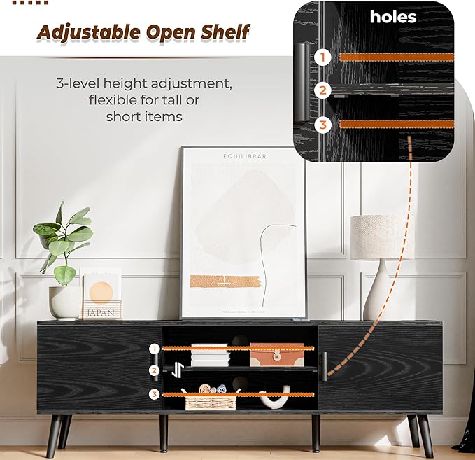 - 【STORAGE & CABLE HOLES】 Adjustable middle shelf is adjustable for 3-level heights, 2 large cabinets hide your sundries. And more, 4 cord holes behind arrange will your wires well. Display or Hide? This black tv stand is good at that