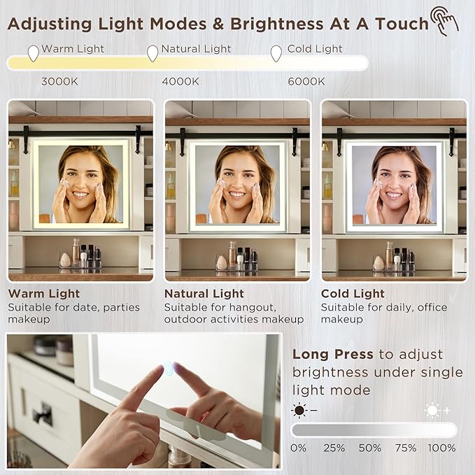 - SLIDING TOUCH CONTROL LIGHTED MIRROR: You can slide the mirror to either side you like freely. Operate the mirror with utmost ease through its intuitive touch control feature. Gently touch the button of the mirror to adjust the 3 color modes included. Long press to adjust the brightness under each light mode, providing you with the perfect ambiance for your makeup application, hair styling routine, or daily skin care. This user-friendly making your daily beauty rituals effortless and enjoyable.