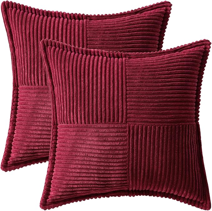 MIULEE Christmas Decorative Euro Sham Throw Pillow Covers for Couch Bed Livingroom 24x24 Inch Set of 2 Burgundy Boho Accent Throw Pllows Broadside Striped Patchwork Soft Corduroy Pillowcases