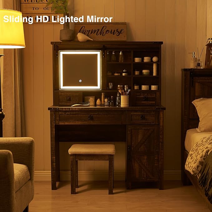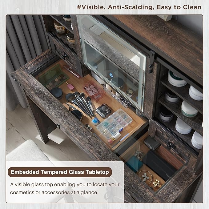 - CHIC FARMHOUSE VANITY DESK: Overall Measuring: 42''W * 15.67''D*54''H.The Glam glass visible tabletop seamlessly blends the farmhouse theme and adds sophistication to the space. Distressed weathered finish in a replicated wood grain with authentic touch—the warm wood tones and barn door elements go together to lend a chic rustic flair. Sliding HD mirror brings a classic touch and adds refinement. This T4TREAM makeup vanity set is your dream bedroom retreat realized