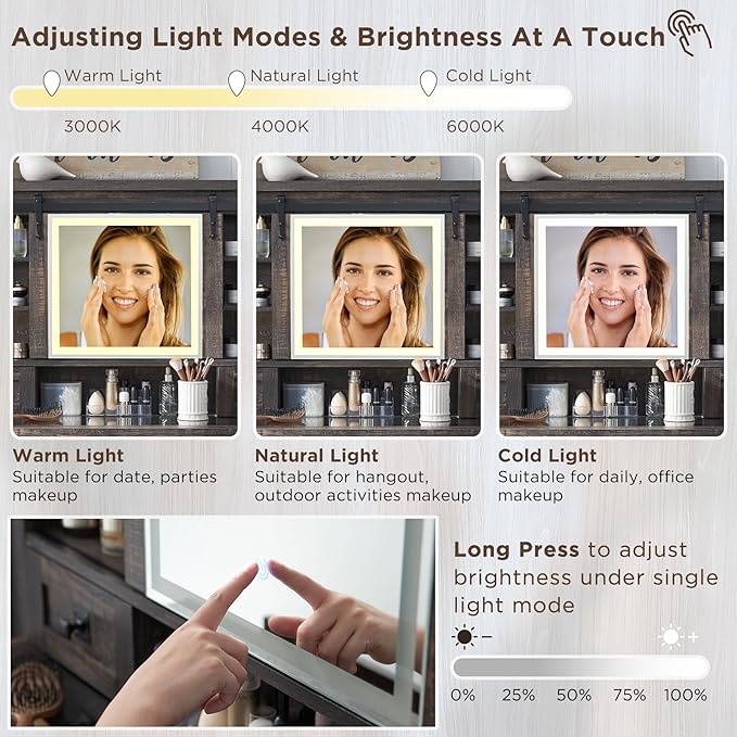 - SLIDING TOUCH CONTROL LIGHTED MIRROR: You can slide the mirror to either side you like freely. Operate the mirror with utmost ease through its intuitive touch control feature. Gently touch the button of the mirror to adjust the 3 color modes included. Long press to adjust the brightness under each light mode, providing you with the perfect ambiance for your makeup application, hair styling routine, or daily skin care. This user-friendly making your daily beauty rituals effortless and enjoyable.