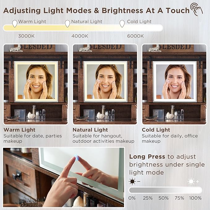 - SLIDING TOUCH CONTROL LIGHTED MIRROR: You can slide the mirror to either side you like freely. Operate the mirror with utmost ease through its intuitive touch control feature. Gently touch the button of the mirror to adjust the 3 color modes included. Long press to adjust the brightness under each light mode, providing you with the perfect ambiance for your makeup application, hair styling routine, or daily skin care. This user-friendly making your daily beauty rituals effortless and enjoyable.