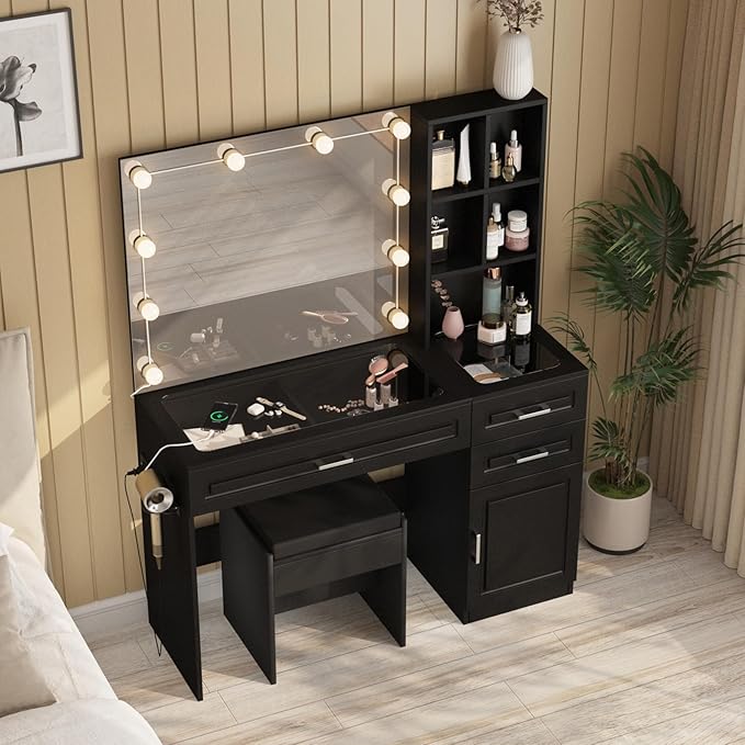 Fameill Vanity Desk with Lighted Mirror & Power Strip,Large Vanity Table with Glass top and Lots Storage,3 Drawer Makeup Desk with Hair Dryer Stand,3 Lighting Modes,Black