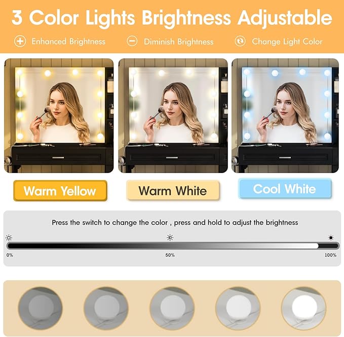 - 【Large Mirror with 10 LED Bulbs】Large makeup mirror can meet your various beauty needs(Mirror size: 31.1" x 26.4"H).Equipped with 10 LED bulbs that Brightness adjustable,available in 3 colors: cold white, warm white and warm yellow,and the brightness of each color can be adjusted,can meet your different makeup needs