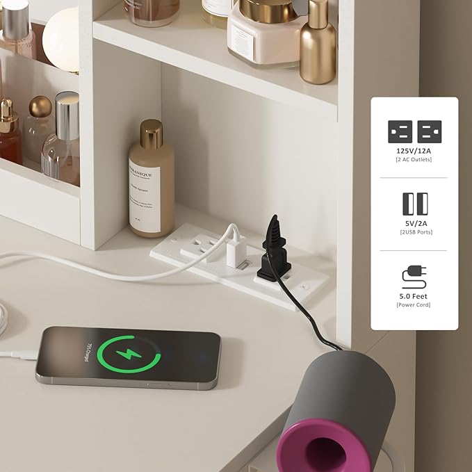 - [Vanity with Charging Station] Don't have charging anxiety! This makeup desk is equipped with power outlets and USB ports to let you charge your phone, computer and other electronic devices at the same time.
