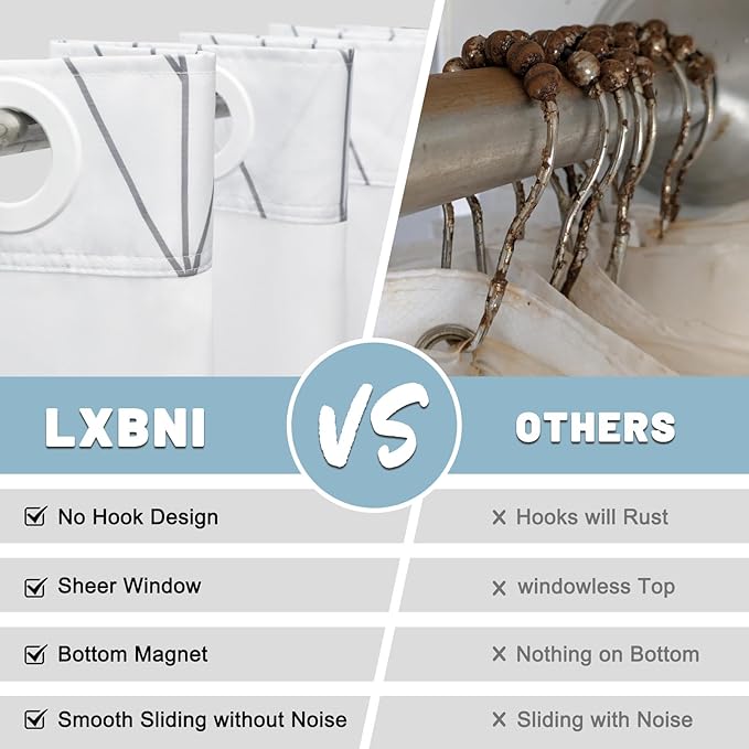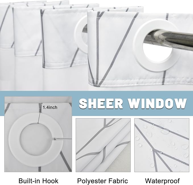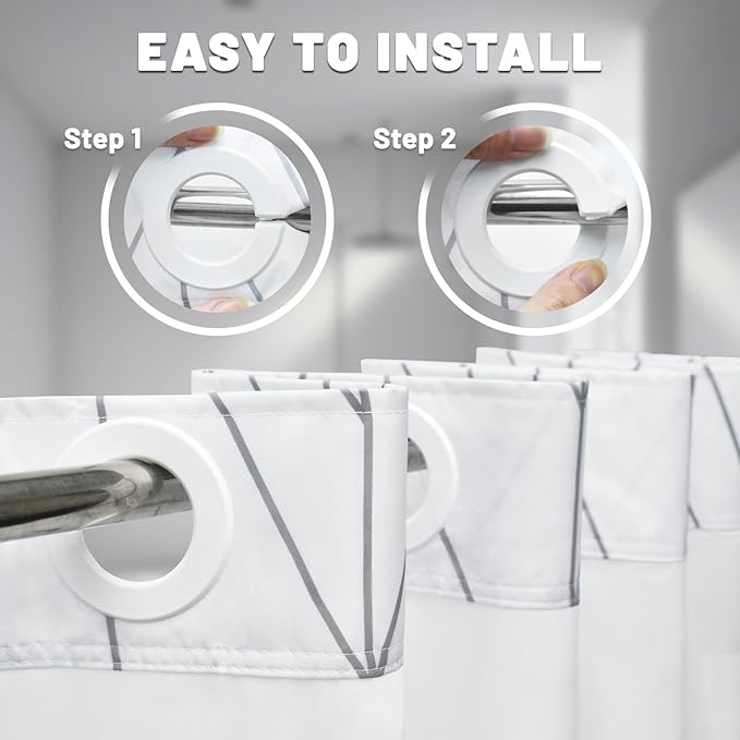 - NO Hook Design: set of shower curtain & snap on/off replaceable liner: no hooks needed design with built-in rings for easy on and off. snap-in waterproof fabric liner is removable when replacing