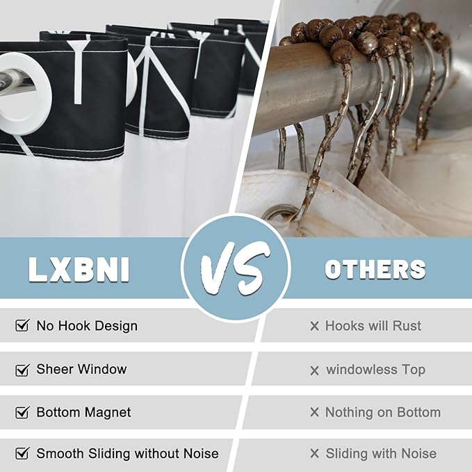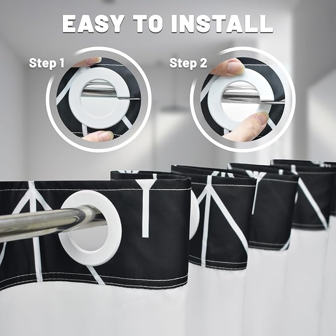 - NO Hook Design: set of shower curtain & snap on/off replaceable liner: no hooks needed design with built-in rings for easy on and off. snap-in waterproof fabric liner is removable when replacing