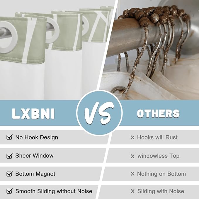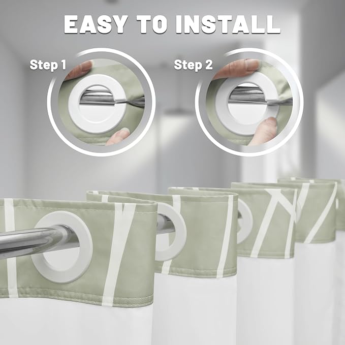 - NO Hook Design: set of shower curtain & snap on/off replaceable liner: no hooks needed design with built-in rings for easy on and off. snap-in waterproof fabric liner is removable when replacing