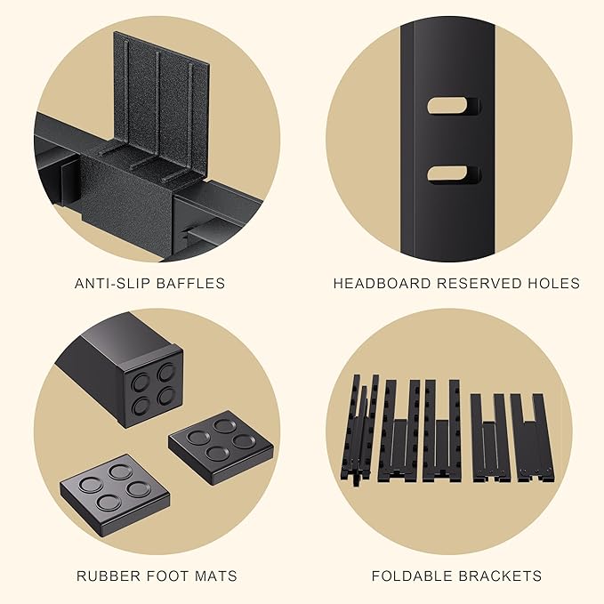 - Noise Elimination: Designed with noise reduction in mind, our bed frame features non-slip gaskets that prevent mattress movement and eliminate annoying squeaking sounds during the night.