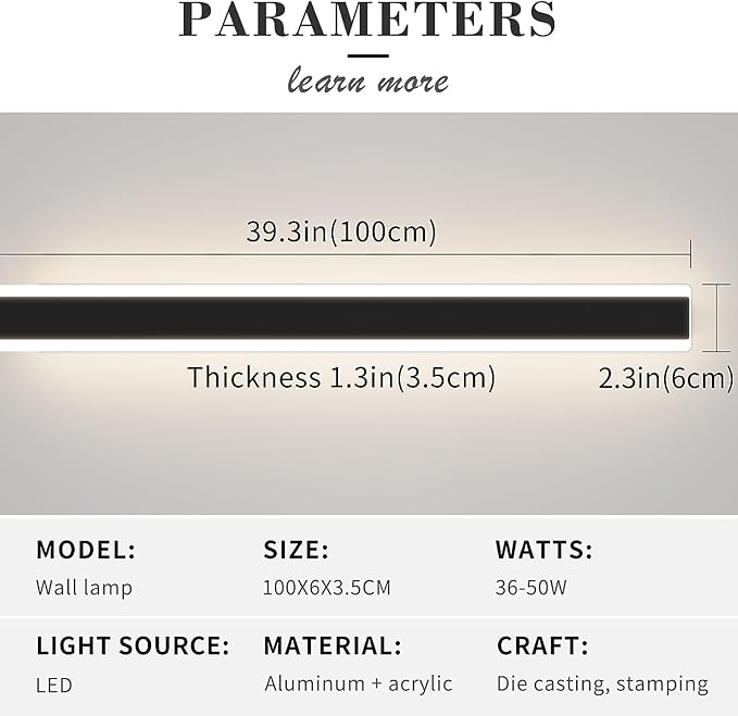 - 【Dimmable Long Wall Light】Power: 60W Size: 23.6/31.4/39/47.2/59/70.8/78.8x2.3x1.5 inches, Voltage: AC 85V-265V. IP65 Rainproof, short-circuit protection design, safer to use, (warm light 3000k) (neutral light 4500k) (cool white 6000k). 3 color temperature options for your experience, to meet a variety of lighting needs. The brightness can with remote control adjusted from 1% to 100% and comes with a memory function that retains your last switch-off settings