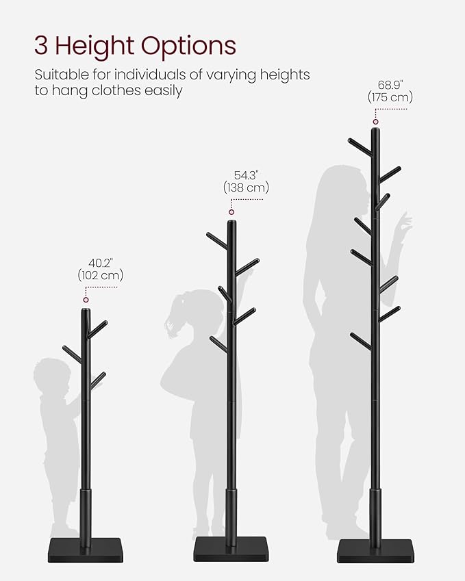 - [3 Height Options] The adjustable coat rack, featuring 3 distinct height options, caters to a variety of user needs. It's the perfect fit for every member of the family, optimizing usage and effortlessly adapting to your lifestyle