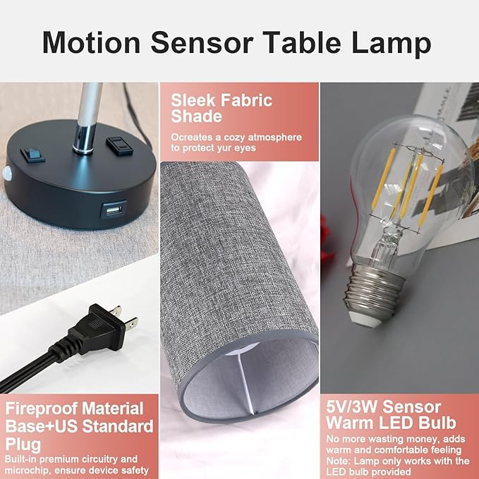 Table Lamps with Motion Sensor and Constant on Two Modes, USB Lamp with Warm White Bulb, Fabric Shade, Built-in USB Port & AC Outlet - Bedside Table Lamp for Bedroom or Living Room