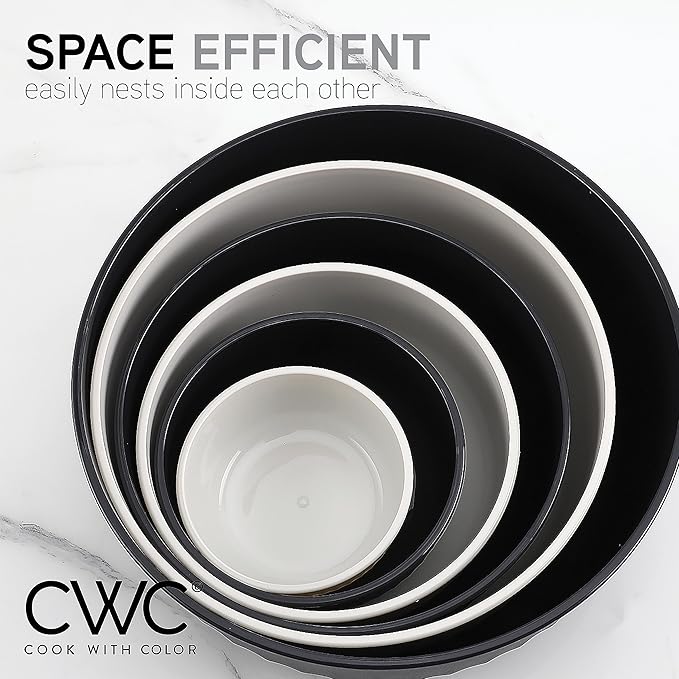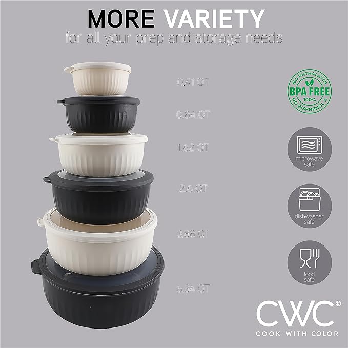 - Cook with Color 12 piece plastic mixing bowl set - non slip bowls with lids; easy to clean, sturdy mixing bowls.