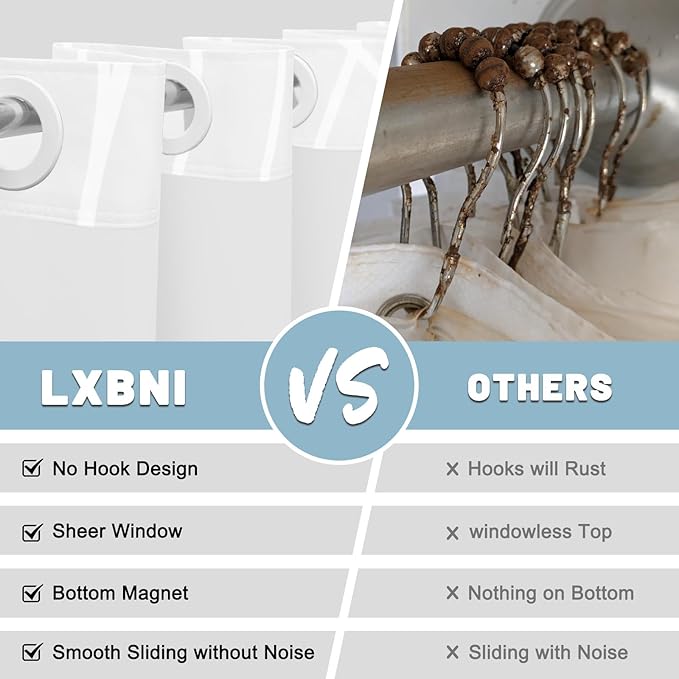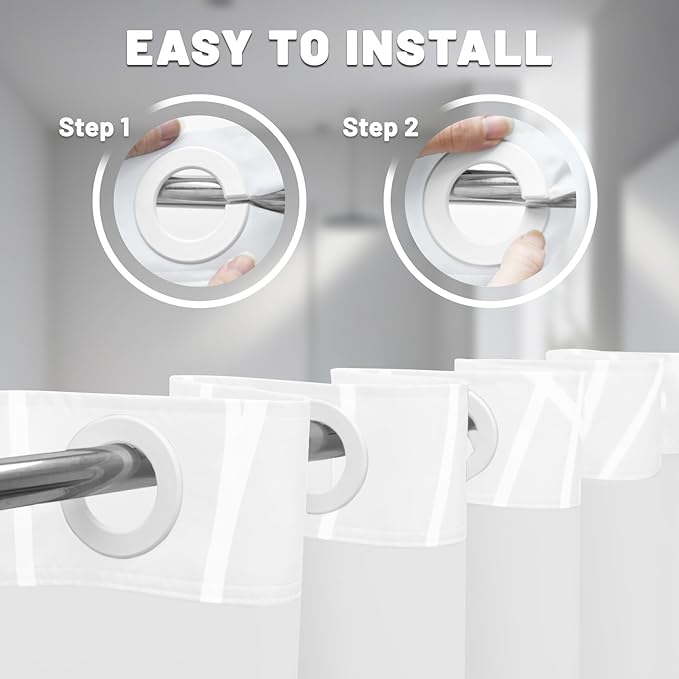 - NO Hook Design: set of shower curtain & snap on/off replaceable liner: no hooks needed design with built-in rings for easy on and off. snap-in waterproof fabric liner is removable when replacing