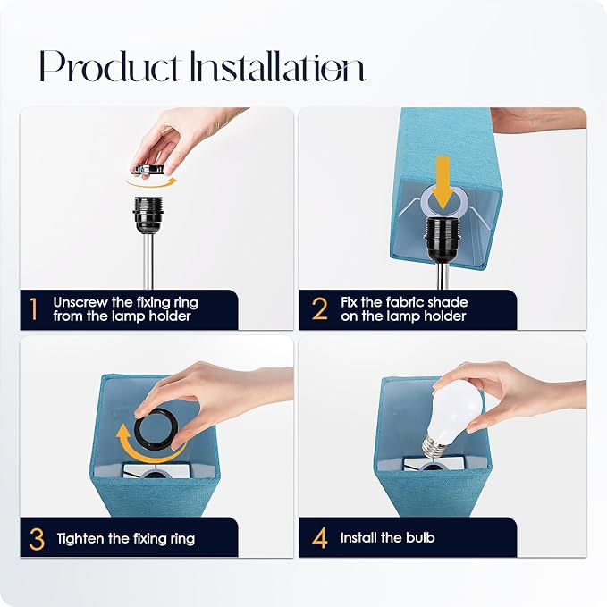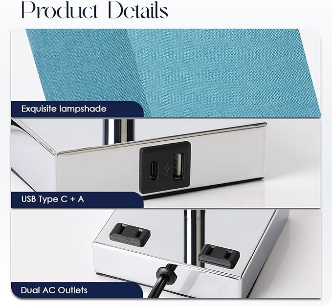 - Minimalist Design: The nightstand lamp features a chrome base and a blue fabric shade that diffuses the light to protect the eyes of you and your family members. Emitting comfortable and even lighting, this bedside lamp creates a relaxing atmosphere in your home