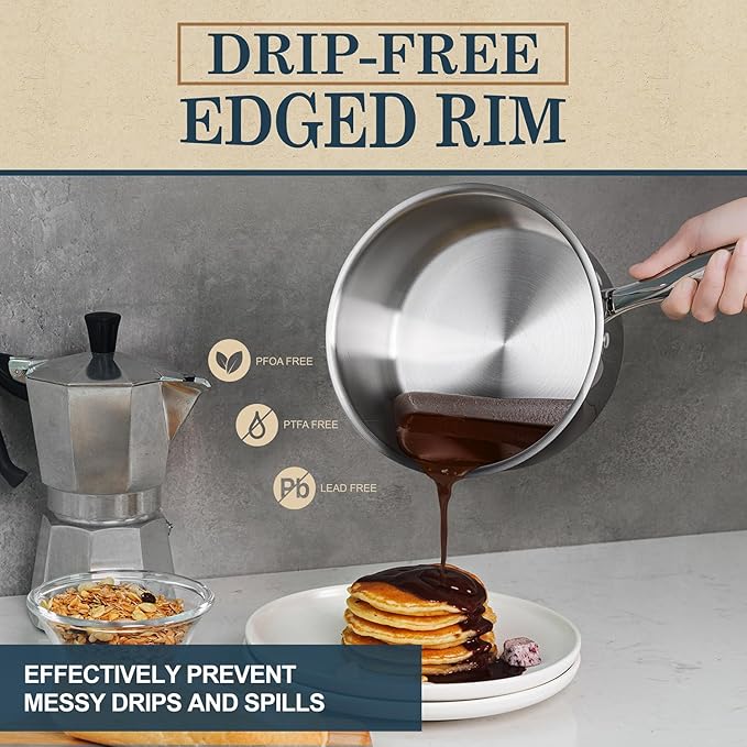 - Improved Pouring: The flared edge provides a drip-free pouring experience, allowing liquids to be poured pan-to-plate without messy spills or drips.