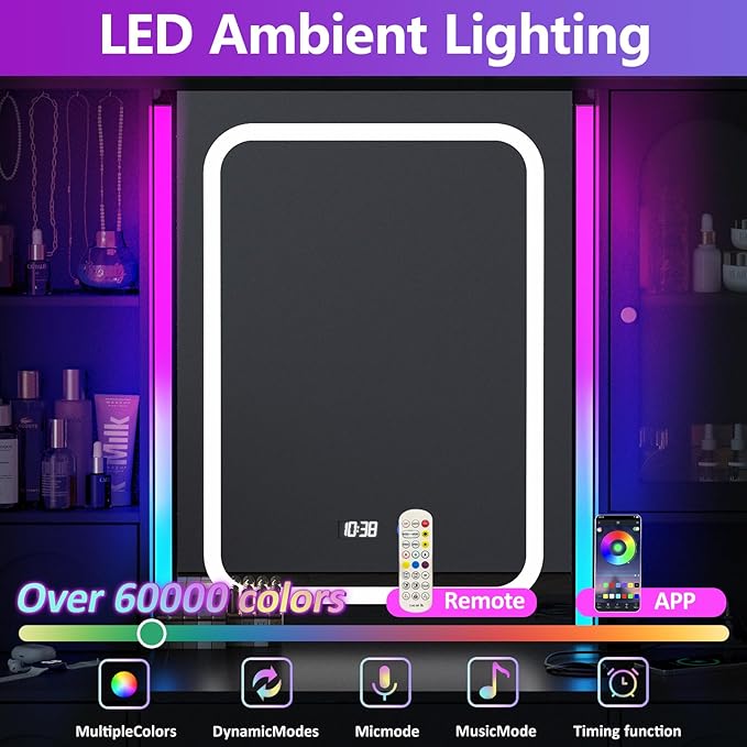 - 【Dressing Table with Ambient Light 】There are 2 LED tubes on both sides of the mirror, can be controlled by mobile APP, remote control, and button control with a variety of colors and light modes to choose from. The charming lighting makes your makeup more ambient , but also be used as background light to take awesome photos and videos.
