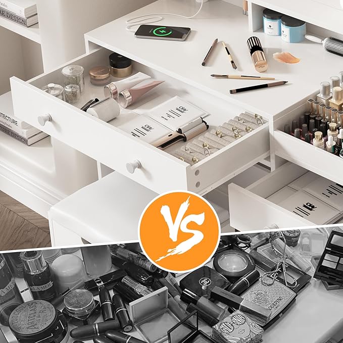 - 【Upgrade Functional Design】Built-in Charging Station, this makeup vanity add 2 standard plug sockets and 2 USB ports, you can easily use hair dryer, curling iron in front the large mirror, and charge your phone or other mobile devices during makeup. Nice make up vanity for bedroom, dressing room, salon or live broadcast.