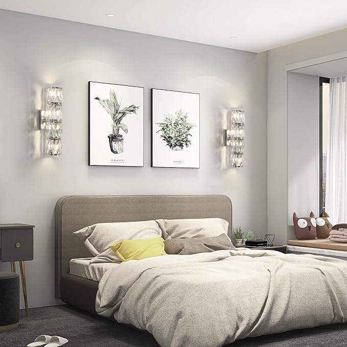 - [ Modern Luxury Design LED Wall Sconce ] The cystal wall sconce adapts electroplated chrome and high quality level crystal. With multi sided irregular polygonal crystal dimensional cutting and different crystal angles to refract bright and shadow from multuple angles.It can bring your home a modern, luxury and elegant atmosphere.
