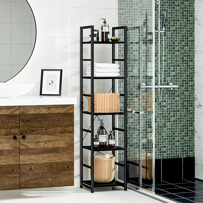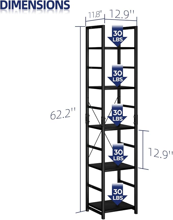 NUMENN 5 Tier Slim Bookshelf, Tall Bookcase Shelf Storage Organizer, Modern Book Shelf for Bedroom, Living Room and Home Office, Black