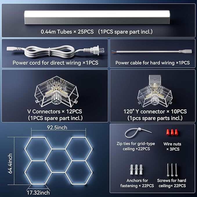 - 【Easy Installation & More Accessories】Each tube of the hexagon LED light can be easily connected together by V and Y connectors, and 25 tubes(Extra 1pcs spare part)can be combined into as many shapes as you want. Besides, more accessories(see advertised pictures)also means you have the opportunity to replace a single tube if it happens to break or malfunction. This ensures convenience and cost-effectiveness, as you won't need to replace the entire lighting system if only one tube needs repair.