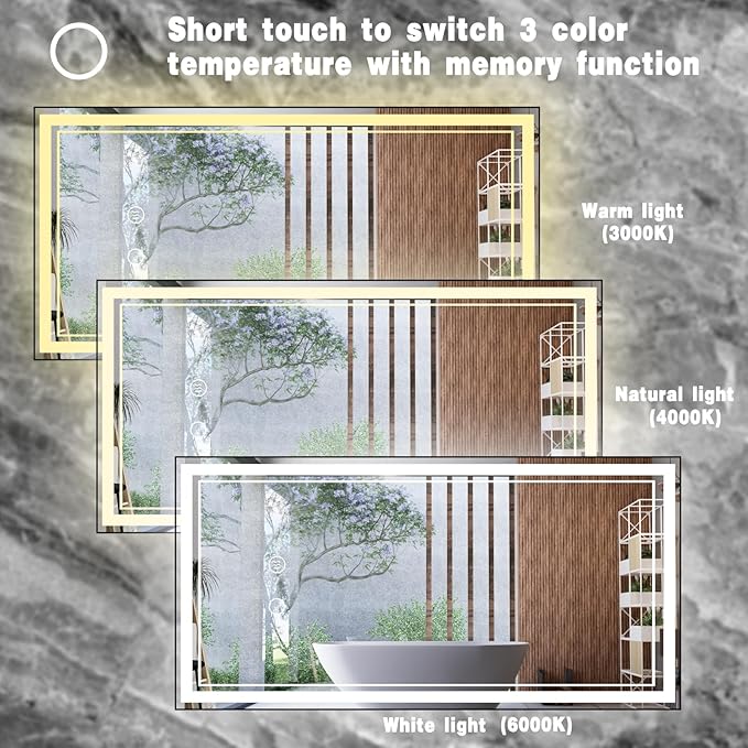 - Adjustmentable High Lumen Brightness & 3 Colors: Framed lighted mirror has 3 color temperature and brightness dimmable mode. Short press to change the light colors (warm light 3000K/natural light 4000K/white light 6000K). Long press to dim the brightness (from 10% to 100%) steplessly. CRI (90+).