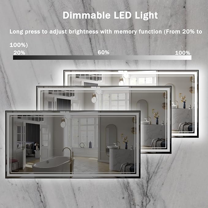 - Adjustmentable High Lumen Brightness & 3 Colors: Framed lighted mirror has 3 color temperature and brightness dimmable mode. Short press to change the light colors (warm light 3000K/natural light 4000K/white light 6000K). Long press to dim the brightness (from 10% to 100%) steplessly. CRI (90+).