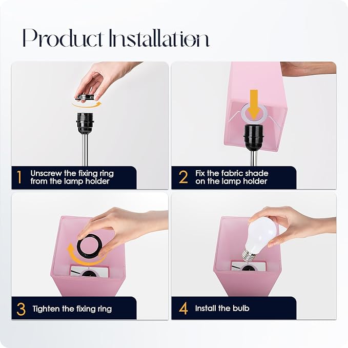 - Minimalist Design: The nightstand lamp features a white metal base and a pink fabric shade that diffuses the light to protect the eyes of you and your family members. Emitting comfortable and even lighting, this bedside lamp creates a relaxing atmosphere in your home