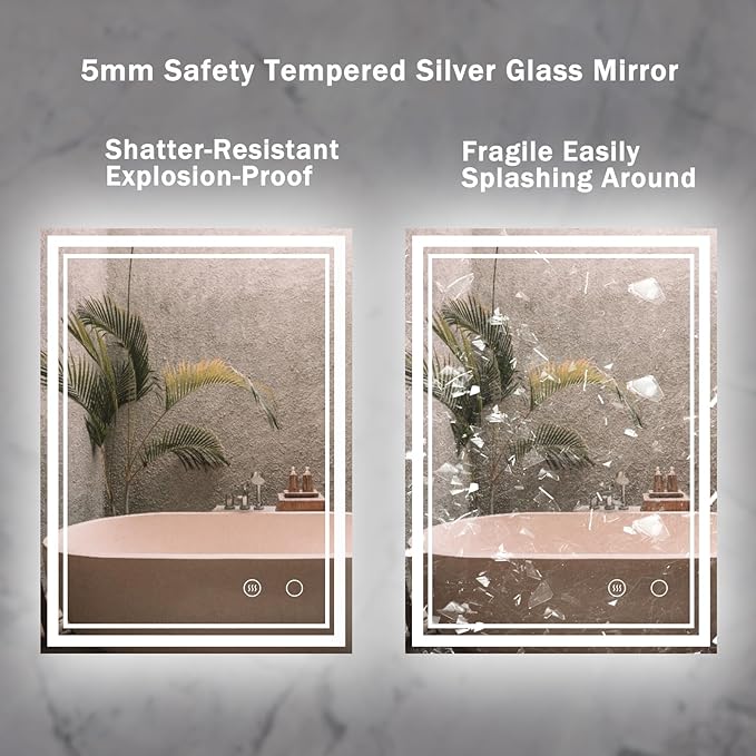 - Easy to install & Plug-in/Hardwired: The LED bathroom mirrors are super easy to install with wall brackets to make sure the mirror hangs securely on wall vertically or horizontally. The mirror can be powered by wiring hardwair directly to electrical cables or plugging into electrical outlet.