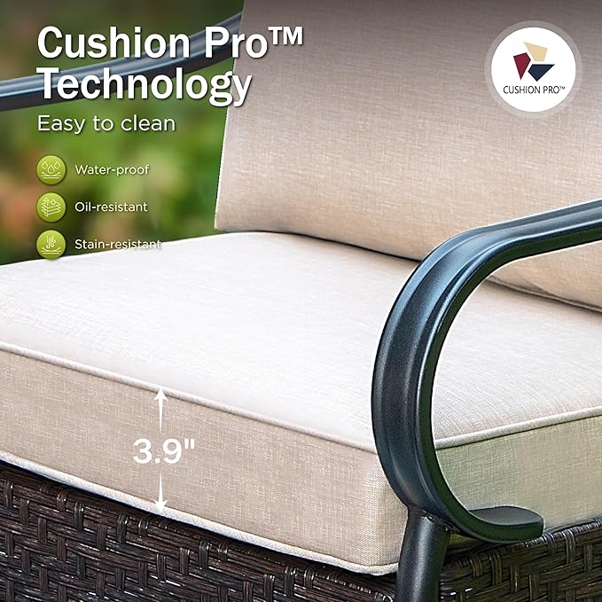- ๐๐ผ๐บ๐ณ๐ผ๐ฟ๐๐ฎ๐ฏ๐น๐ฒ ๐ฃ๐ฎ๐ฑ๐ฑ๐ฒ๐ฑ ๐๐๐๐ต๐ถ๐ผ๐ป๐: Every patio stationary metal dining chair comes with extra large seat cushion and soft pillow, easy to clean. All cushions and pillows are made of texture fabric,which is UV resistant,weather resistant, does not discolor easily