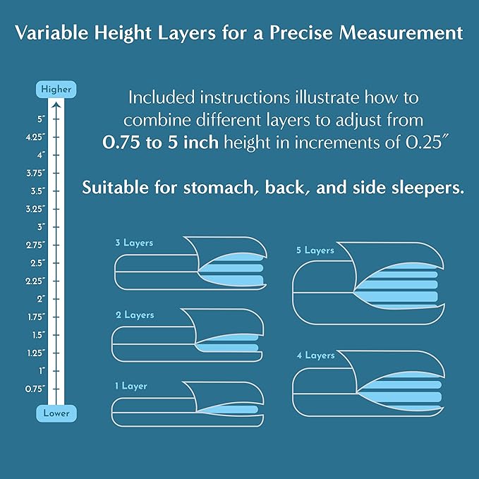 - FIND YOUR IDEAL PILLOW HEIGHT: The Bluewave Bedding Versalayer Memory Foam Pillow is like having 16 pillows in one, adjustable from 0.75" to 4.25" in precise 0.25" increments with a maximum height of 5". Make small adjustments until your neck pain disappears!