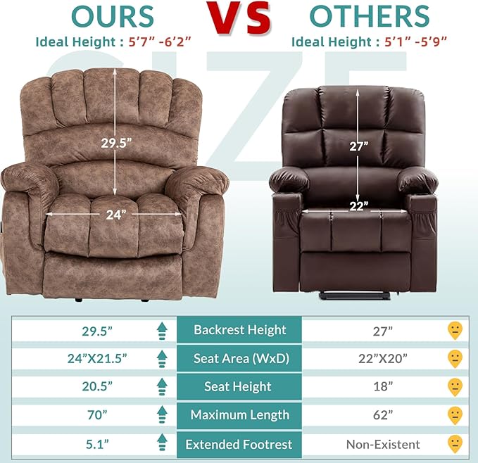 - 【Humanization Design】 - This tall man recliner with 38.5inch widen fan-shaped backrest, provide extremely comfort for your neck, back and lumbar. The electric lift chair has dual USB outlets that keep your must-have device fully charged and close to you. Meanwhile, Dual side pockets for small items within reach. (Notes: The USB ports ONLY for low-power devices, such as iPhone, iPad)