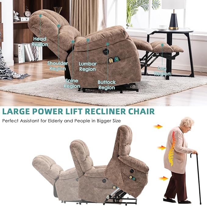 MEETWARM Large Power Lift Electric Recliner Chair with Extended Footrest for Elderly, Big and Tall Lift Chair for Seniors Reclining Chair for Living Room with Massage and Heated,USB Ports(Plush-Brown)