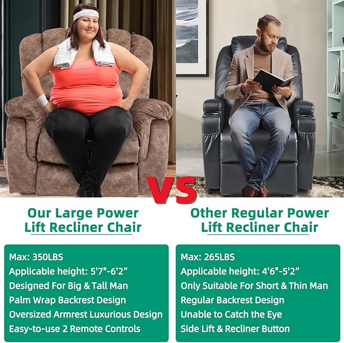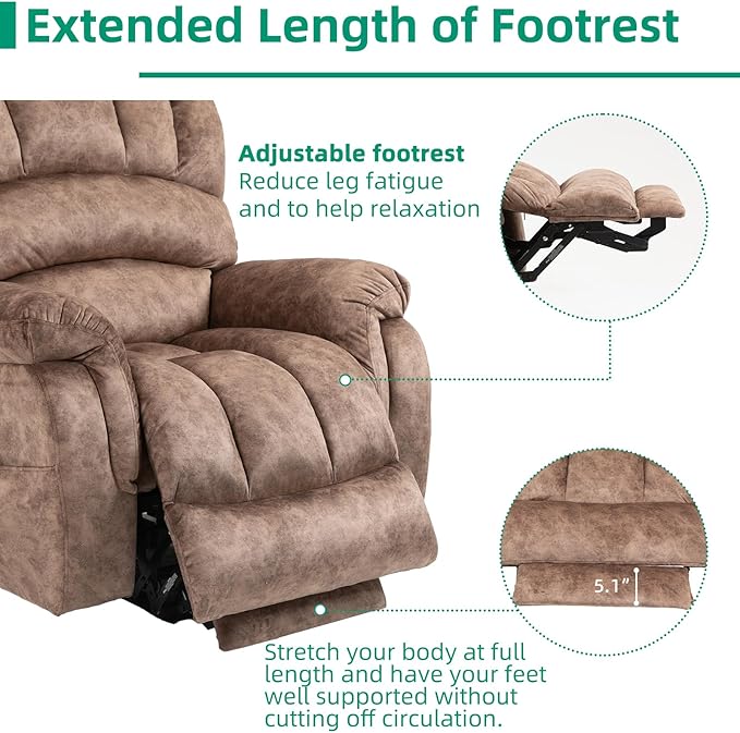 - 【Big and Tall Lift Chair for Seniors】We listen to every single customer suggestion, and added an additional 5.1" extension to the footrest while extending the backrest, which better fits the needs of taller men. The extended recliner can really stretch your body at full length and still have your feet well supported without cutting off circulation (Recommended Height: 5'7"-6'2")