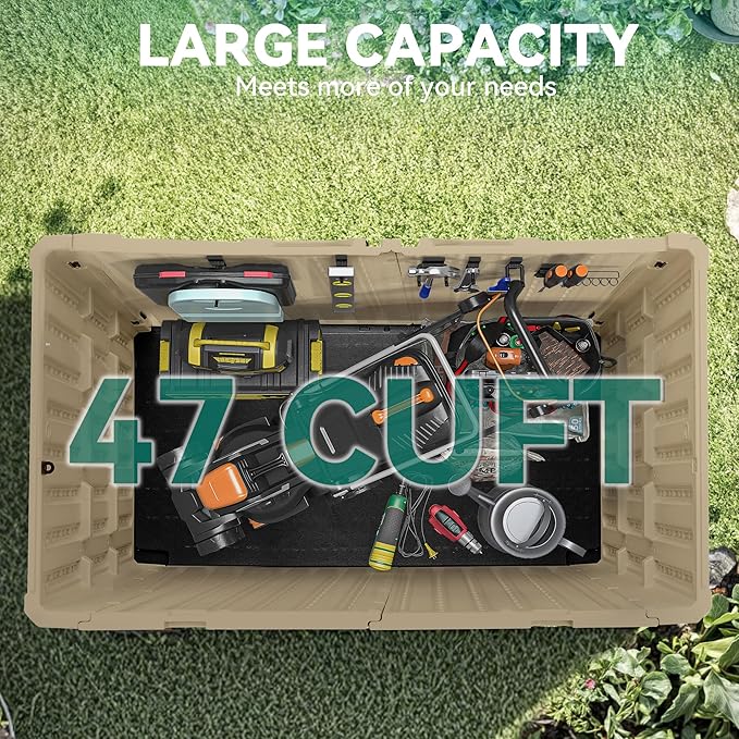 - LARGE STORAGE CAPACITY- This plastic storage shed boasts a 47 cu ft capacity; Suitable for storing gardening tools,lawn mowers, bicycles, garden furniture or 2 trash cans; You can add another laminate shelf (50.5x23.8 inch, NOT included) to maximize storage capacity; Exterior measures 53.2''L x 33.2''W x 46.3''H, and the interior measures 50.8''L x 29.9''W x 44.5''H