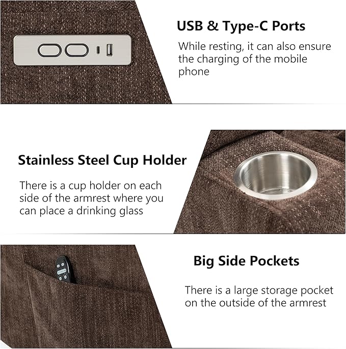 - Win in the Details: You can put your drinks in our 304 stainless steel cup holders, solid and heatproof. Meanwhile, side pockets also provide great convenience for storing books, magazines, or other small things.The USB and Type-C charging ports at the side of the recliner will allow you to charge your mobile devices while enjoying a movie or reading a book. (Notes: The USB and Tape-C ports are ONLY for low-power devices, such as mobile phones and min fans.)