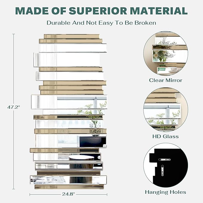 - SPECTACULAR DESIGN:Some glass strips of different sizes interlock with each other to form this very distinctive wall mirror. The smooth edges of strips are hand polished to ensure safety