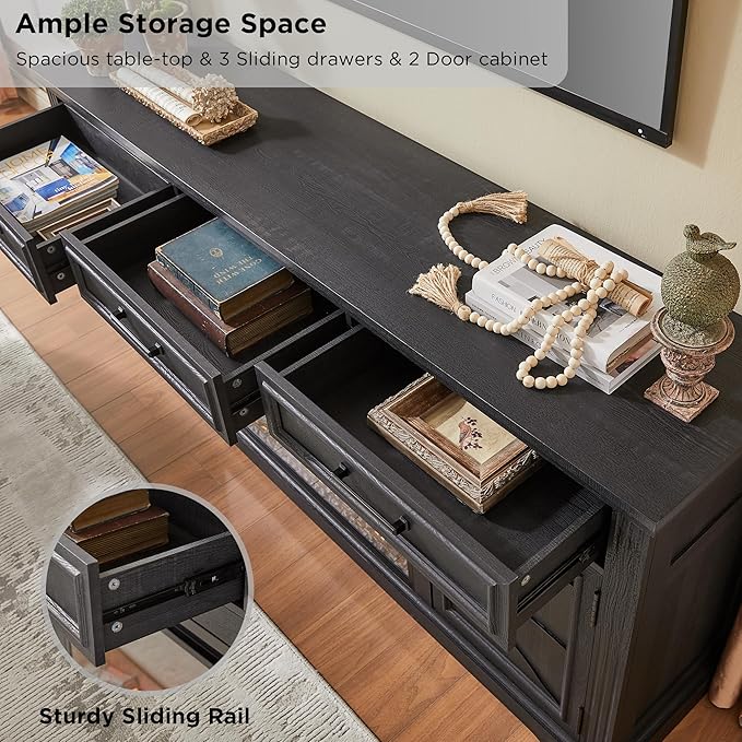 - Ample Storage Space: This TV stand features a spacious stand top, 2 storage cabinets, and 3 big drawers, providing ample space to organize and store your media accessories, remote controls, DVDs, and other decor items. Keep your entertainment area clutter-free and organized.