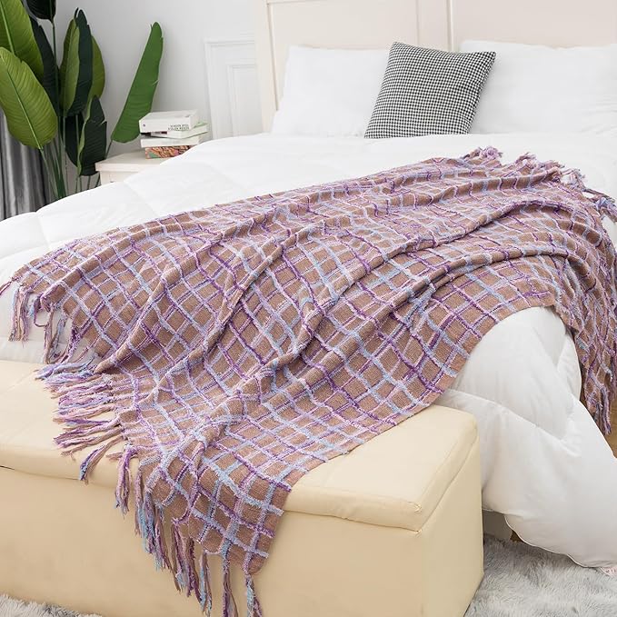 Gealaek Boho Throw Blanket Lightweight Fuzzy Soft Cozy Decorative Blankets for Sofa Bed Farmhouse Throw Blanket Mexcican Blanket with Tassel Khaki Purple Pink Textured 50" x 60"