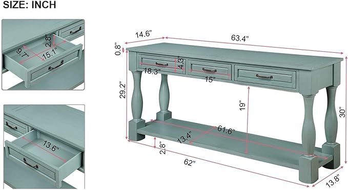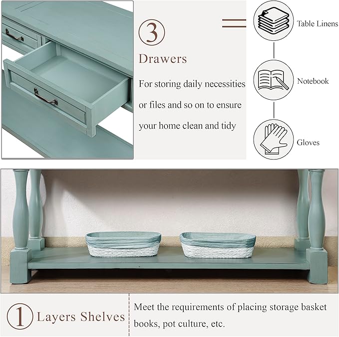 63inch Solid Wood Console Table with 3 Drawers and 1 Bottom Shelf Extra-Thick Sofa Table(Retro Blue)