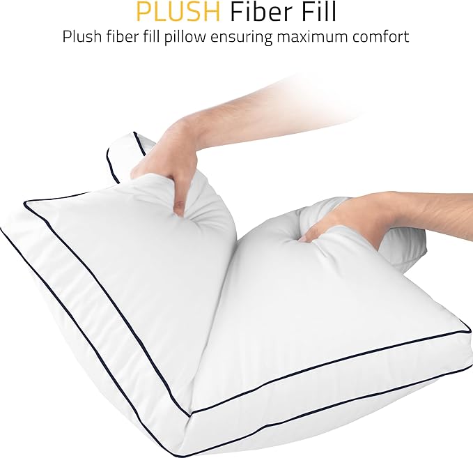 - Gusset Bed Pillows – Set of 2 white gusset bed pillows with navy piping and double stitching that gives a sophisticated look to the pillows and also improves durability