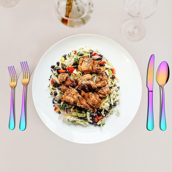 - 【HIGH QUALITY】Rainbow silverware set is made of superior food grade stainless steel, the flatware cutlery set are corrosion and rust resistant, solid and won't bend easily, durable and healthy, and this flatware never needs to be polished, making care and maintenance easy.